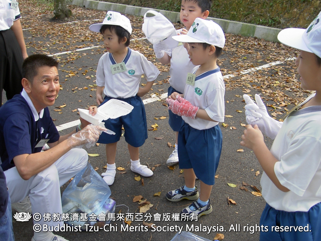 今天的第一个节目是环保小尖兵,大家跟着队辅爸爸妈妈来到院外的停车场,看见沥青路上布满了垃圾,大家一股脑儿地把垃圾捡起,带回院内进行资源分类。成金爷爷扮演的回收商,把回收的资源换成现金,大家一致同意把善款交给师公上人,做救人的工作。