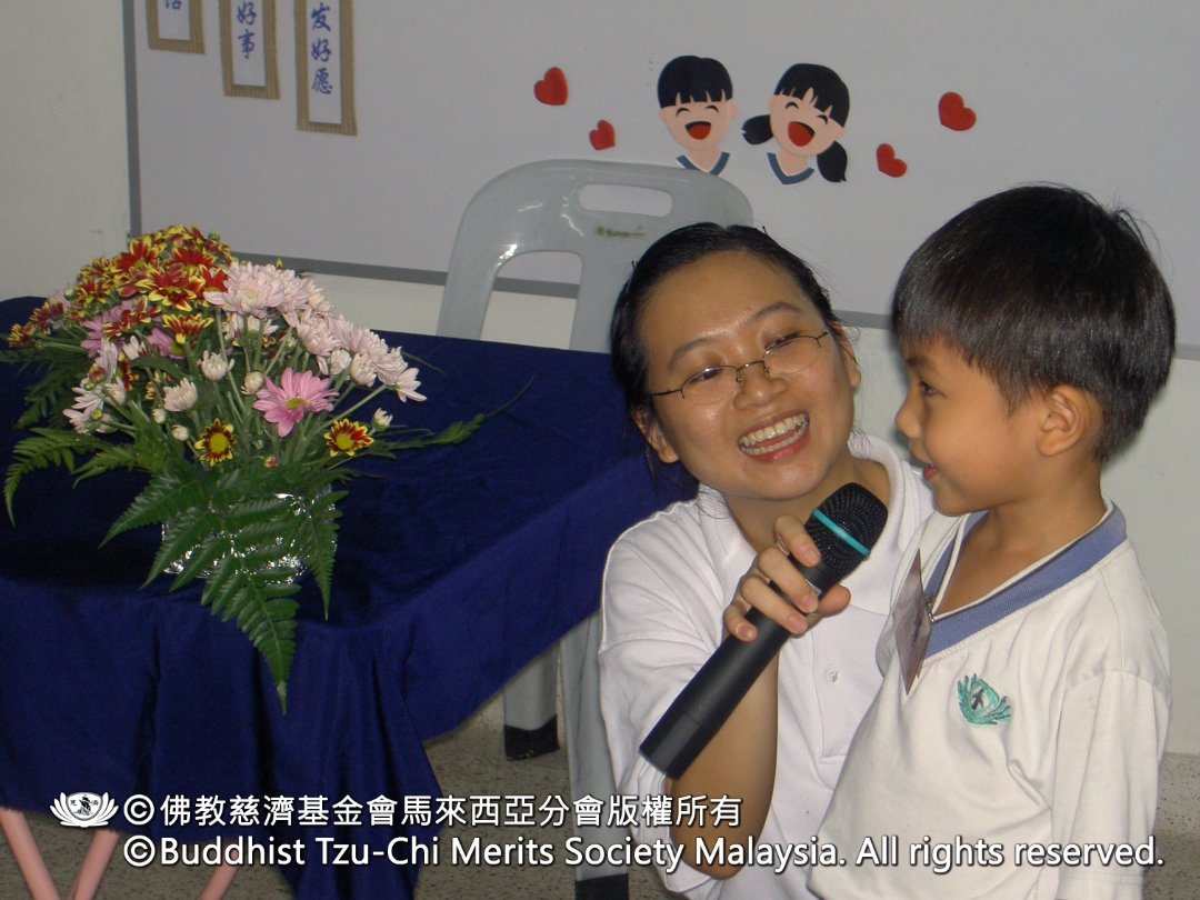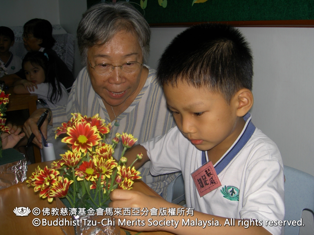 不多久,大家各自摆好了自己所插毕的花卉,老师请小朋友们出来一一分享。靖乐说,自己插的花叫乐乐花,他要把这盆花送给爸爸妈妈,感谢他们多年来的照顾;廉生为他插的花取名为爱爱花,要送给父母及印尼女佣。