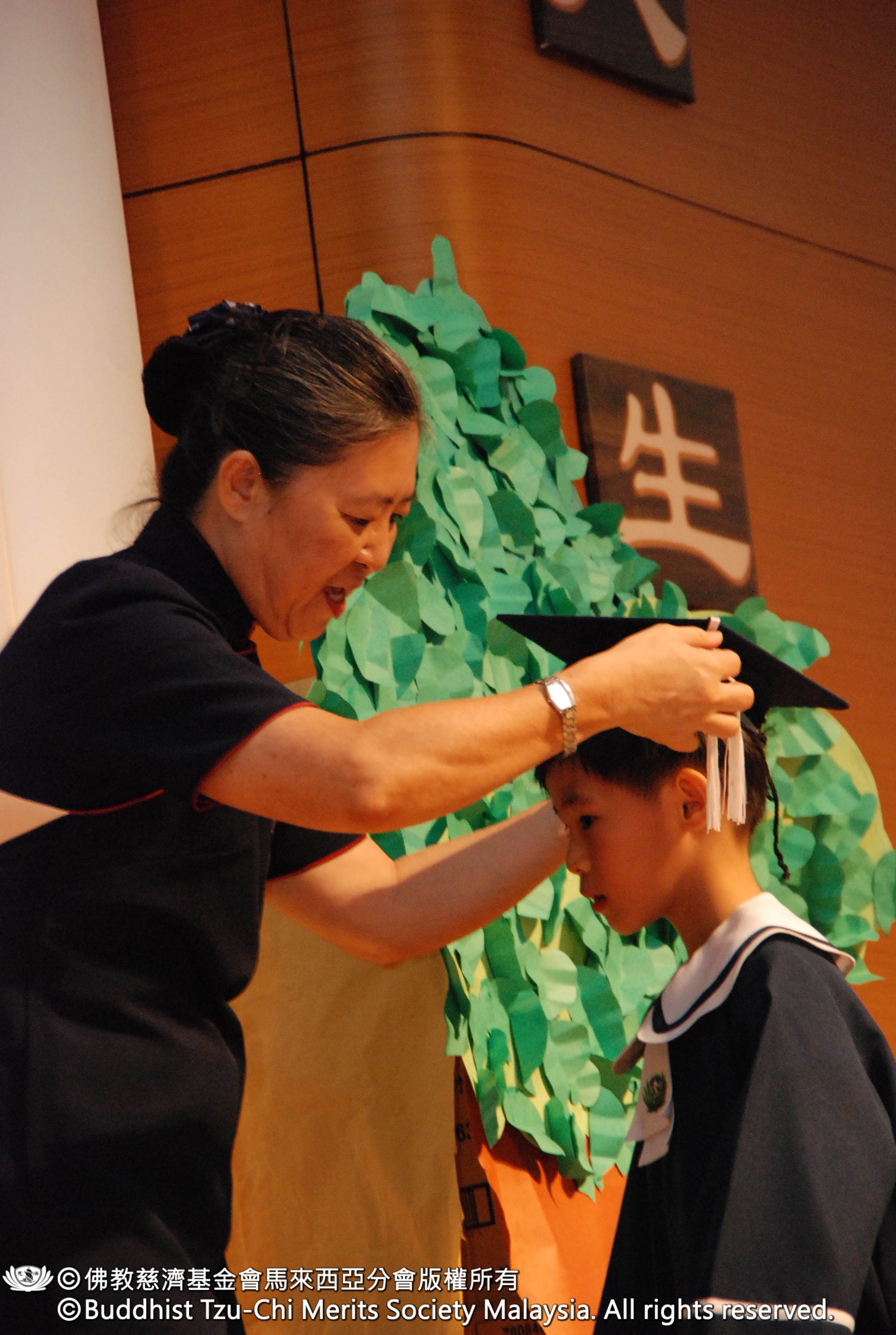 聲聲祝福後,接著進行撥穗儀式。畢業生排成一列,輪流上臺讓園長吳芳英(慈僖)師姊為他們撥穗,新山支會副負責人李有日(濟肅)師兄頒贈畢業證書,何蔚菁(慈劻)師姊頒贈結緣品。可愛的四歲和五歲小朋友,以「愛的鼓勵」掌聲為臺上的哥哥姊姊鼓掌與歡呼。
