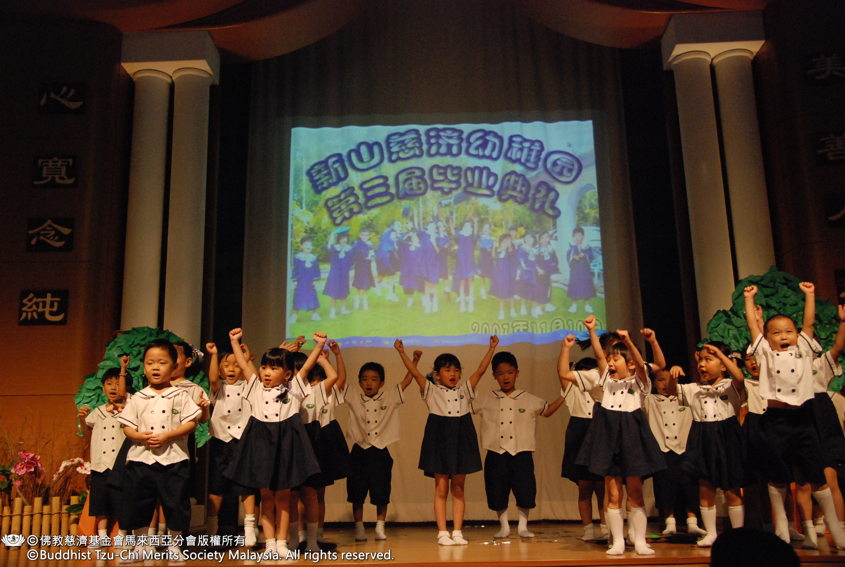 一張張播映在銀幕上的照片,是小朋友平時在日常課程中的生活寫照。此次是新山慈濟幼稚園第三屆畢業典禮,園長、老師和大愛家長的努力,在今天獲得成果驗收。