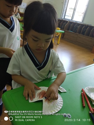 两天后,信心二班的孩子们迎来了字母“f”的趣味课堂。这一次,孩子们拿到的是纸盘和鱼形卡片。他们自由地在“鱼儿”身上涂色,用彩笔描绘出独一无二的鳞片与花纹。在粘贴鱼眼和鱼尾时,孩子们小心地对准位置、涂抹胶水,这不仅锻炼了手眼协调能力,也让他们在组合中理解部分与整体的关系。完成的作品活灵活现,仿佛一条条彩色的鱼儿正游出纸面。老师还准备了羽毛、渡轮等其他以“f”开头的学习单,帮助孩子们在辨认中拓展词汇认知。