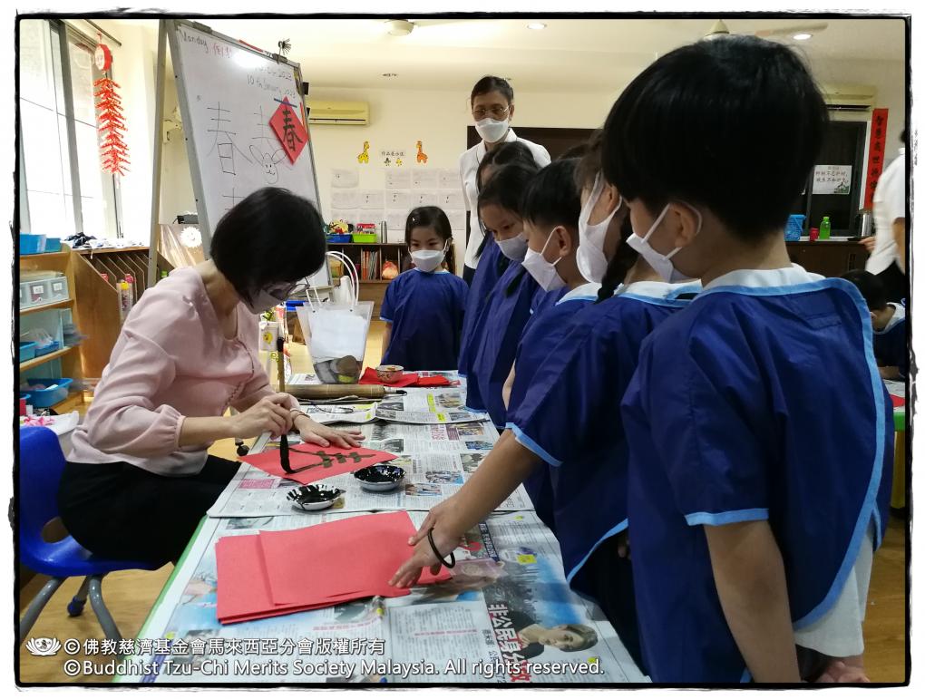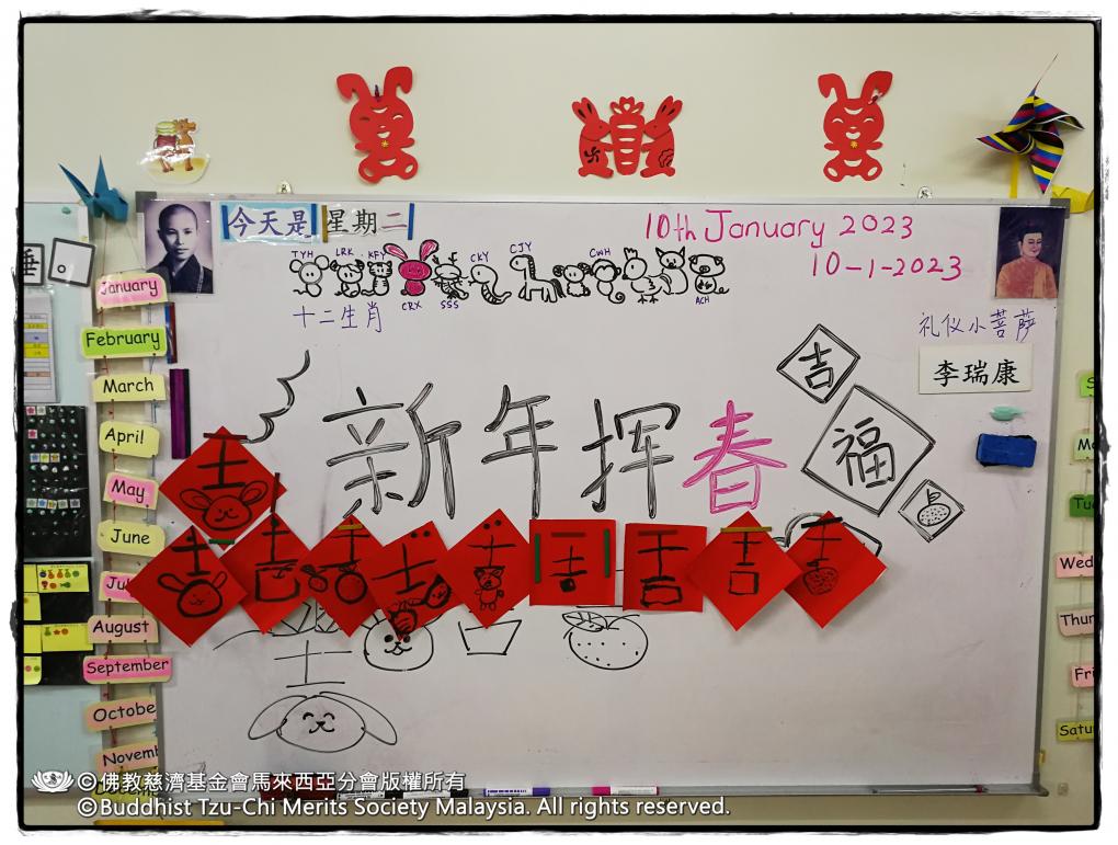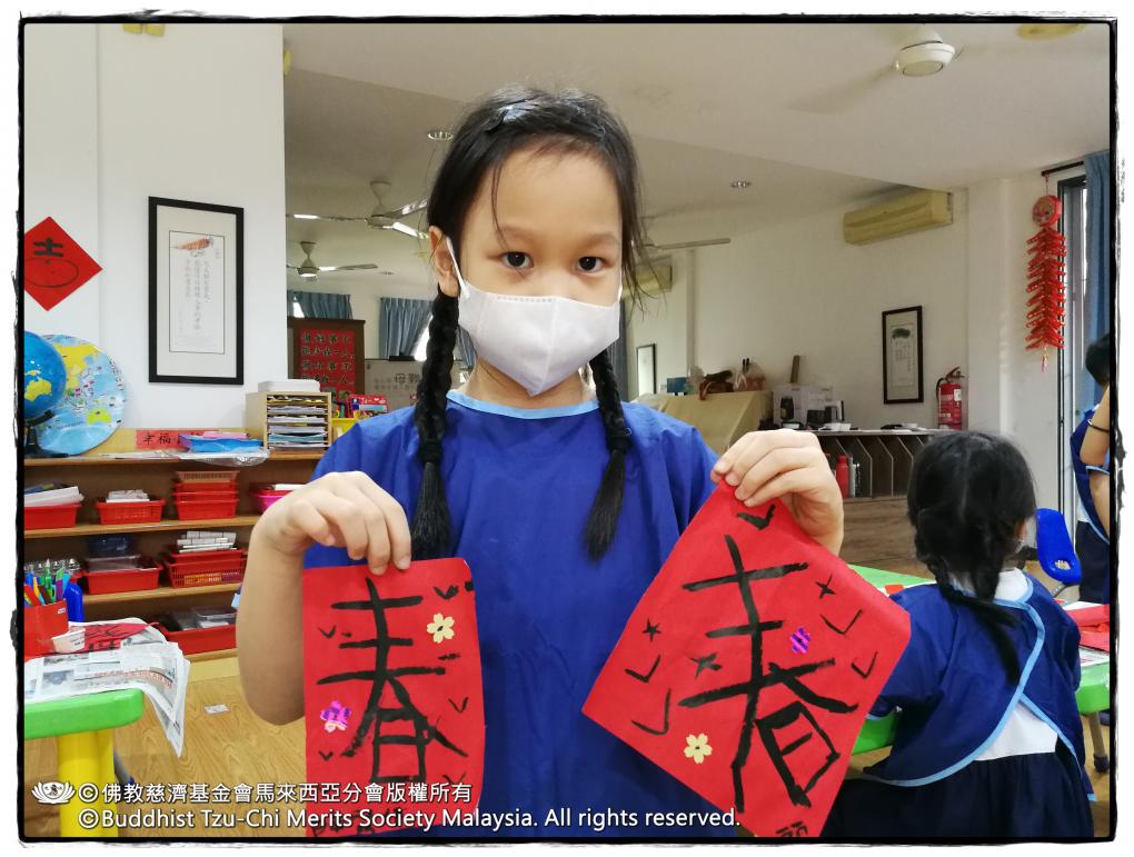教育志業 20230110_新山慈济幼儿园【挥春】 10 1 月 Community: myjbselectionmyjbBranch: 馬來西亞分會挥春,是中华民族传承已久的艺术形式。每逢新春,家家户户张贴挥春,既为辞别旧岁,也为喜迎新年。为延续这一文化传统,新山慈济幼儿园于2023年1月10日组织全园幼儿开展了挥春创作活动。 孩子们在红纸上认真书写祝福,再以清雅梅花点缀其间。活动现场洋溢着浓浓的节日氛围,一张张挥春不仅传递出童真的祝愿,也让孩子体验到亲手创作的成就感。他们将这份承载心愿的作品带回家中,更将新春的喜气与文化的韵味融入生活。 返回上一頁 古來聯絡處 華族歲末發放 20230111_上供下結_檳城極樂寺慈善醫院