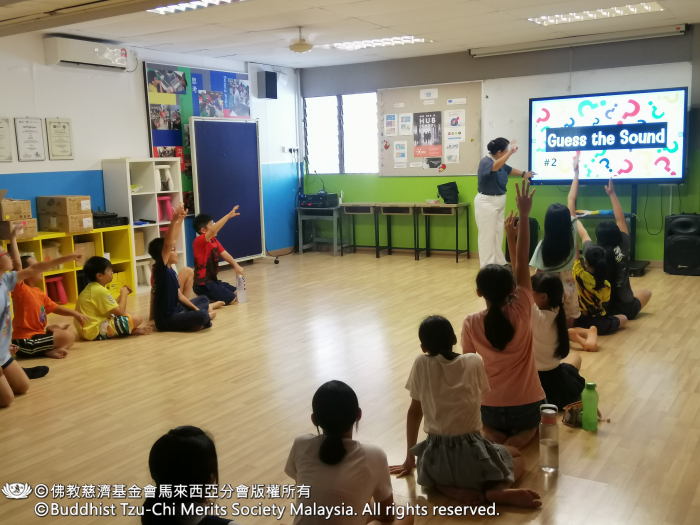 今天玉心师姊带动孩子们玩猜声音的游戏。游戏分成两个环节。首个环节让孩子们听的都是生活上可接触到的声音,例如飞机起飞声,猫头鹰的呜叫声,水龙头开水声,盘掉落裂开声,原子笔开关声 ,割草机和吸尘机的声音等等。通过活动希望让孩子们能把漂浮不定的心安住以当下,用心聆听和辨别声音的不同质量。