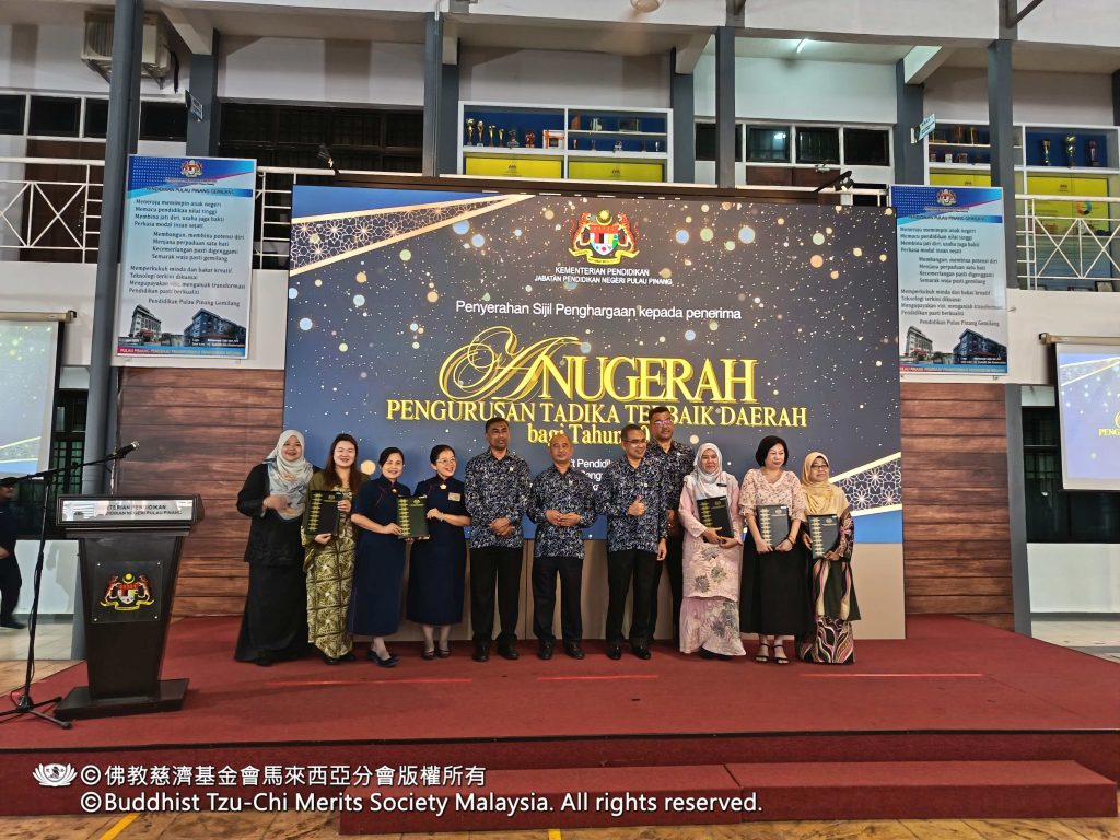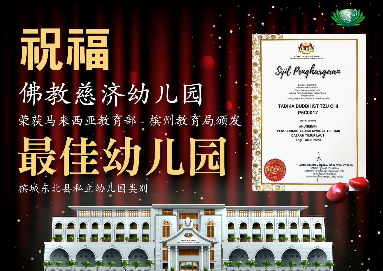 6月26日,在「槟州教育局列会暨奖状颁发典礼」上,槟城佛教慈济幼儿园因在2024年校本评估中表现卓越,获颁「槟城东北县最佳私立幼儿园」。典礼由教育局总监亲自颁奖,慈芊主任、慈晴主任、慈规主任、丽婷园长及丽华老师代表接受。