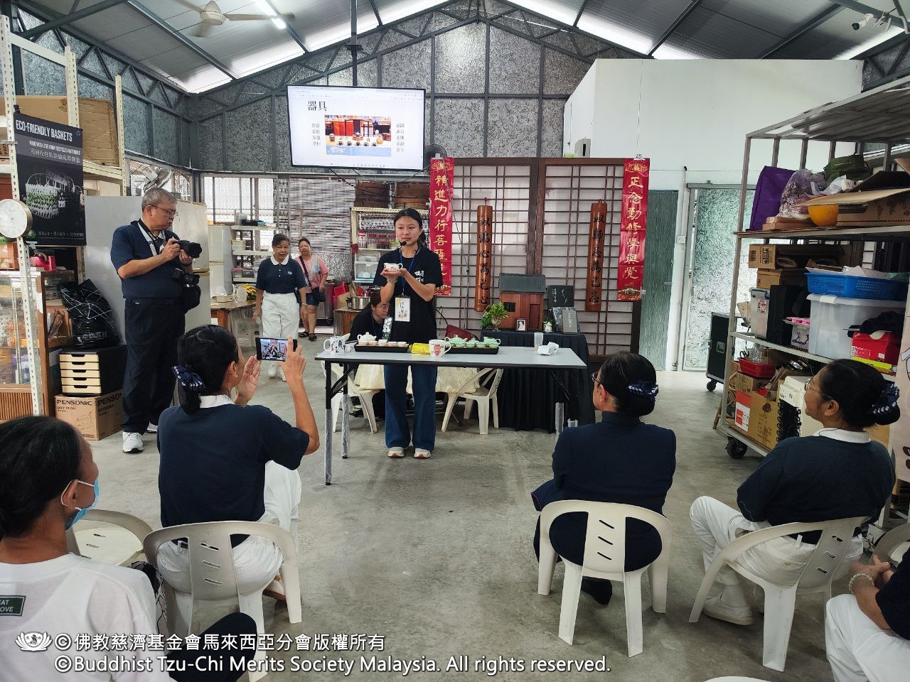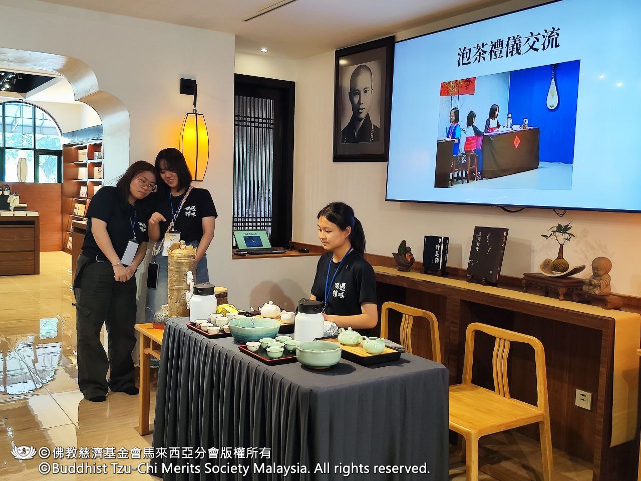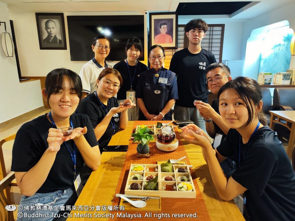 參訪靜思書軒時,擅長茶道的學生分享臺灣茶藝文化,介紹茶具使用與品茗特色。慈濟志工回應以茶道中的人文精神,並分享如何將靜思茶道融入幼兒教育,同時以淨斯點心款待來賓,讓青年志工對靜思產品有更深認識。