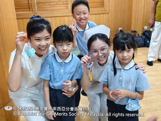 家長呂敏慧師姐感恩擁有健康身體,坦言身邊有許多需要幫助的人,願趁著身體康健多行善舉。黃寶玲師姐代表親子,向醫護人員與腎友贈送結緣品。收到小兔子燈籠的護理人員們十分開心,紛紛與孩子們合影留念。