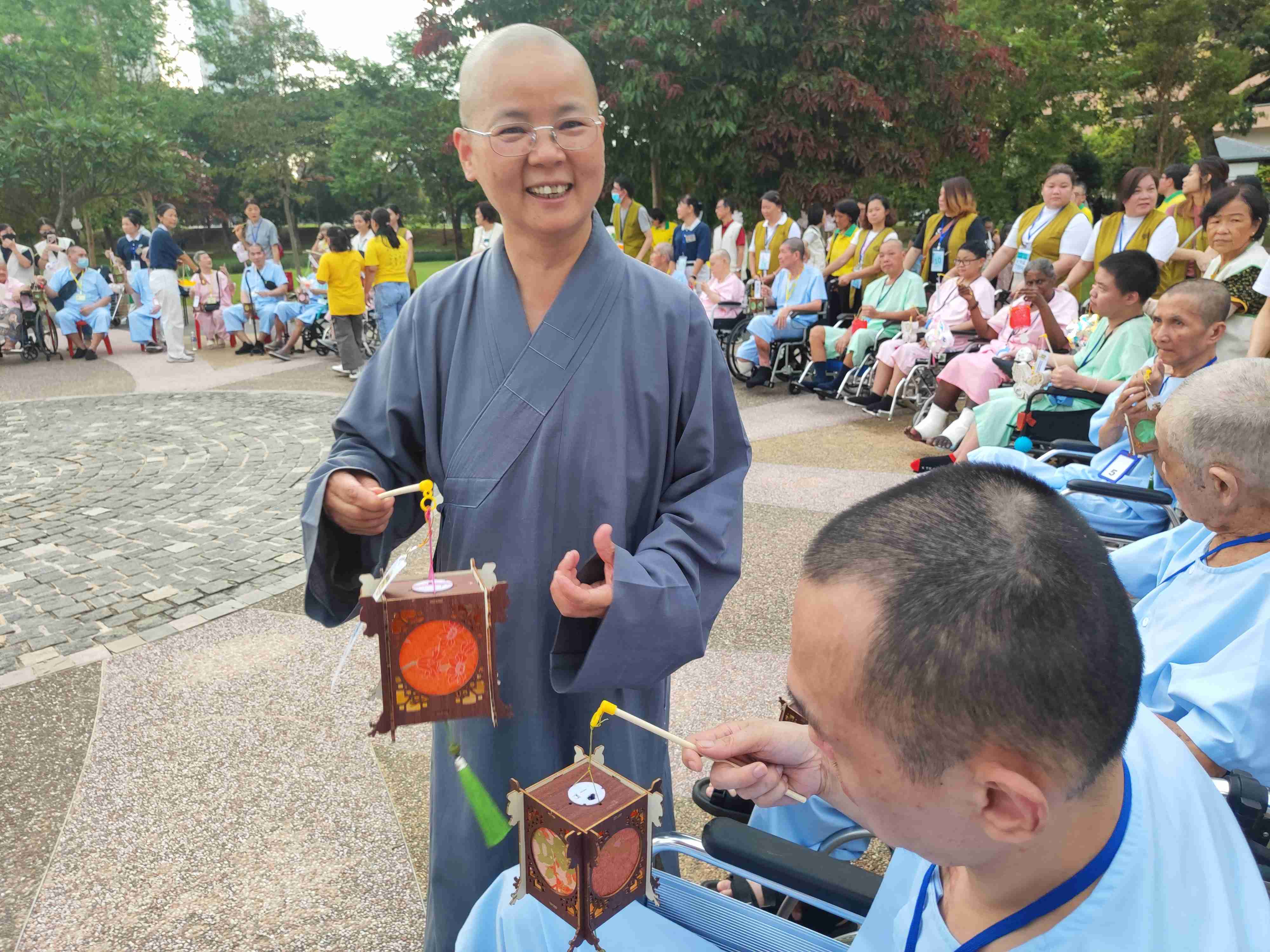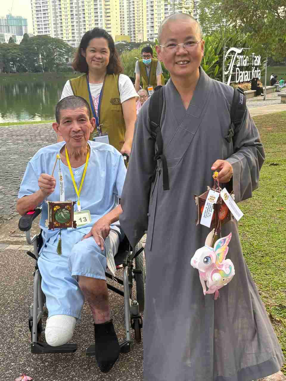 46位雪蘭莪靜思書軒志工為57位淨願關懷中心院友與志工舉辦戶外中秋活動,在吉隆坡文良港翠湖公園提環保燈籠散步一圈,演繹手語與唱歌,感受中秋節氣氛。