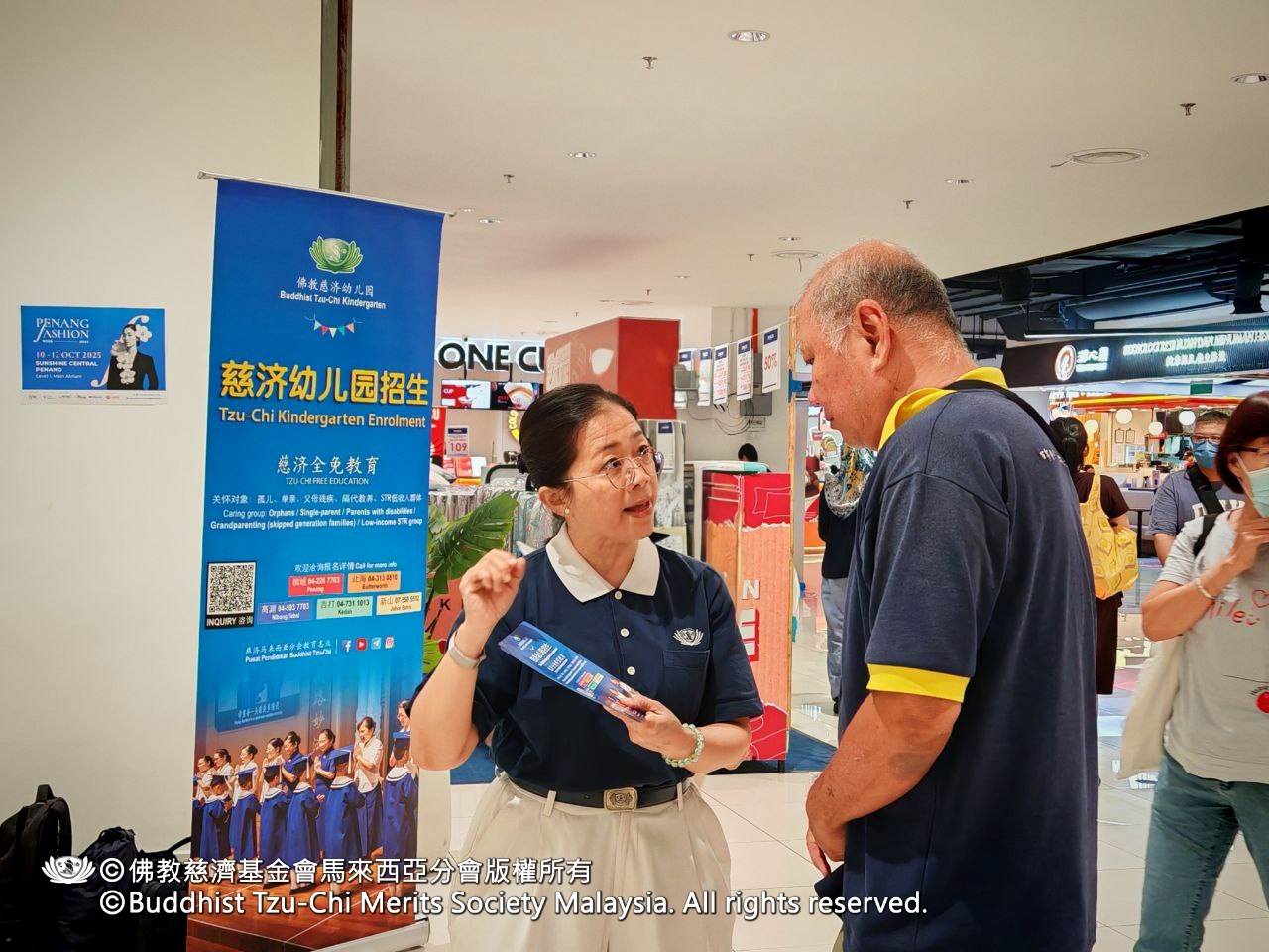 2025年10月11日至12日,慈济志工于发林阳光商城(Sunshine Central Farlim)及周边场域,配合“一人一善”运动,开展了一场温馨的“希望教育”宣导活动。此次活动获得商场管理层的慈悲支持,让志工得以在Sunshine Central设立宣导点,向社会大众介绍慈济全免教育的理念与实践。