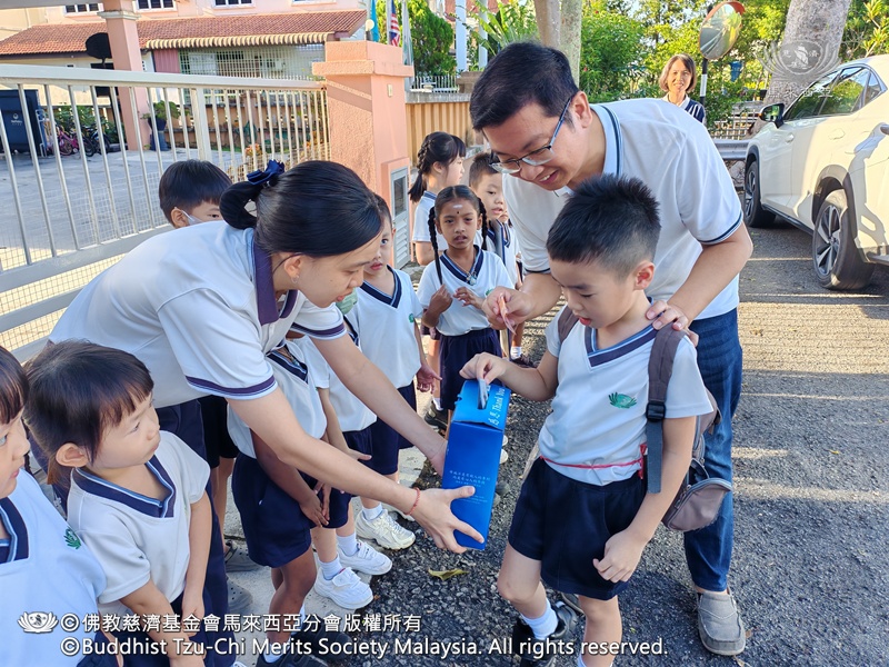 2025年10月13日早晨,高渊慈济幼儿园老师和志工带领学生,于校门口向家长募爱心,以行动传递「 一人一善」的爱与善念。