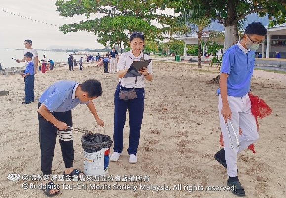 隨後親子隊伍前往海邊淨灘,家長持單記錄,孩子執夾提桶撿拾垃圾,海風拂面,溫馨滿溢。活動中,麗雯師姐邀請三位馬來小弟參與,他們不僅堅持到最後,還主動提醒回收空瓶;三歲萌娃認真護衛海洋動物的家,稚語稚行滿是熱忱;彭亨州游客受此感染,表示歸鄉後要深耕環保事務;害羞的曾泓瑋在父親鼓勵下,勇敢向晨練老伯推廣淨灘活動;一戶遊玩家庭也受邀加入,全家齊心分類撿拾,成為沙灘上的溫暖風景;BAGAN JAYA中學的三位同學結伴而來,直言活動既淨化環境,又增進同學情誼。
