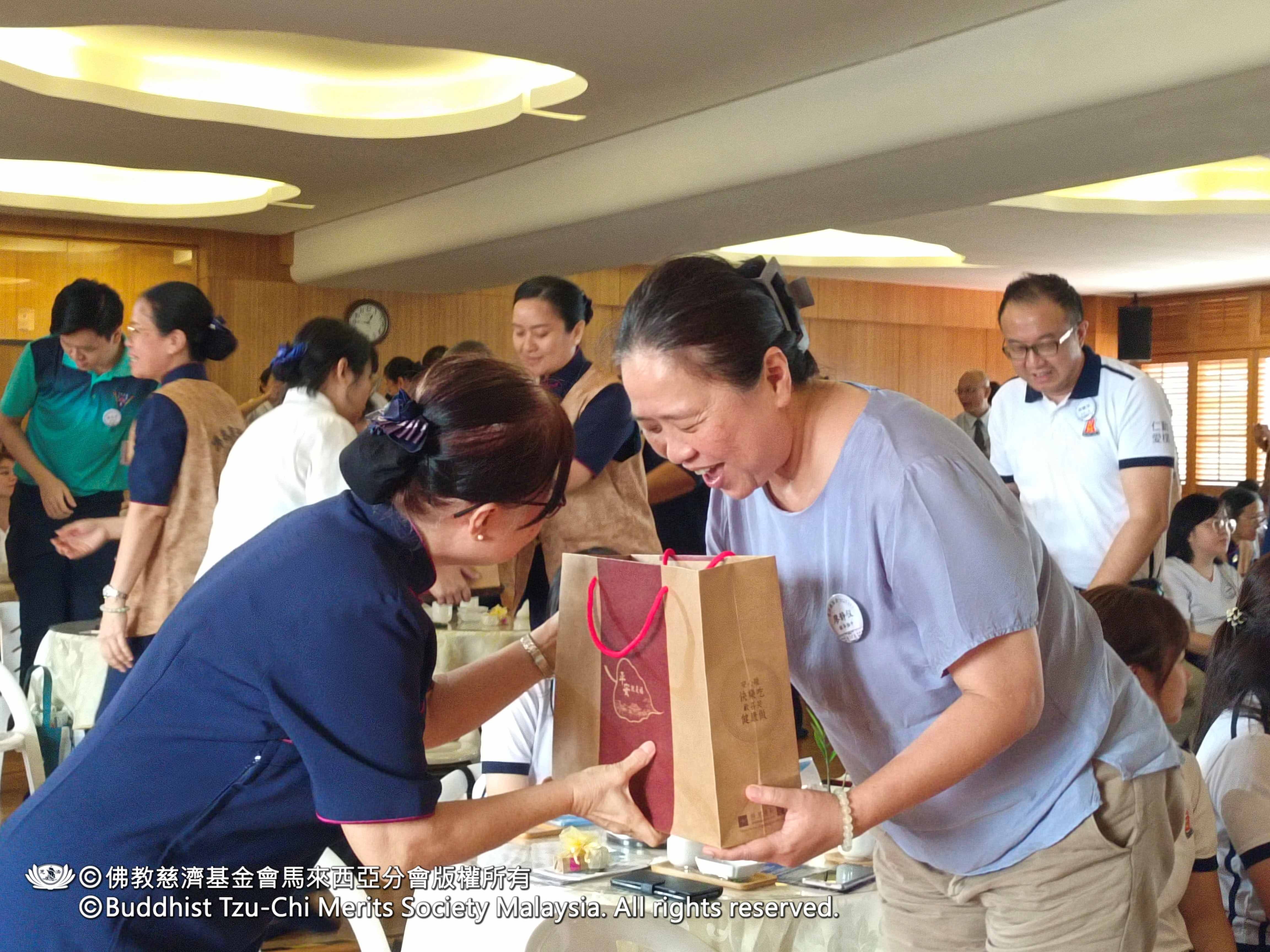 活动尾声,主任及园长团队感恩各校校长这五年来对慈济人文入校园的护持,才有校长联谊会今时今日的浩荡规模。教育同仁们出列送上结缘品后,大家便移步西礼堂享用素食飨宴了。