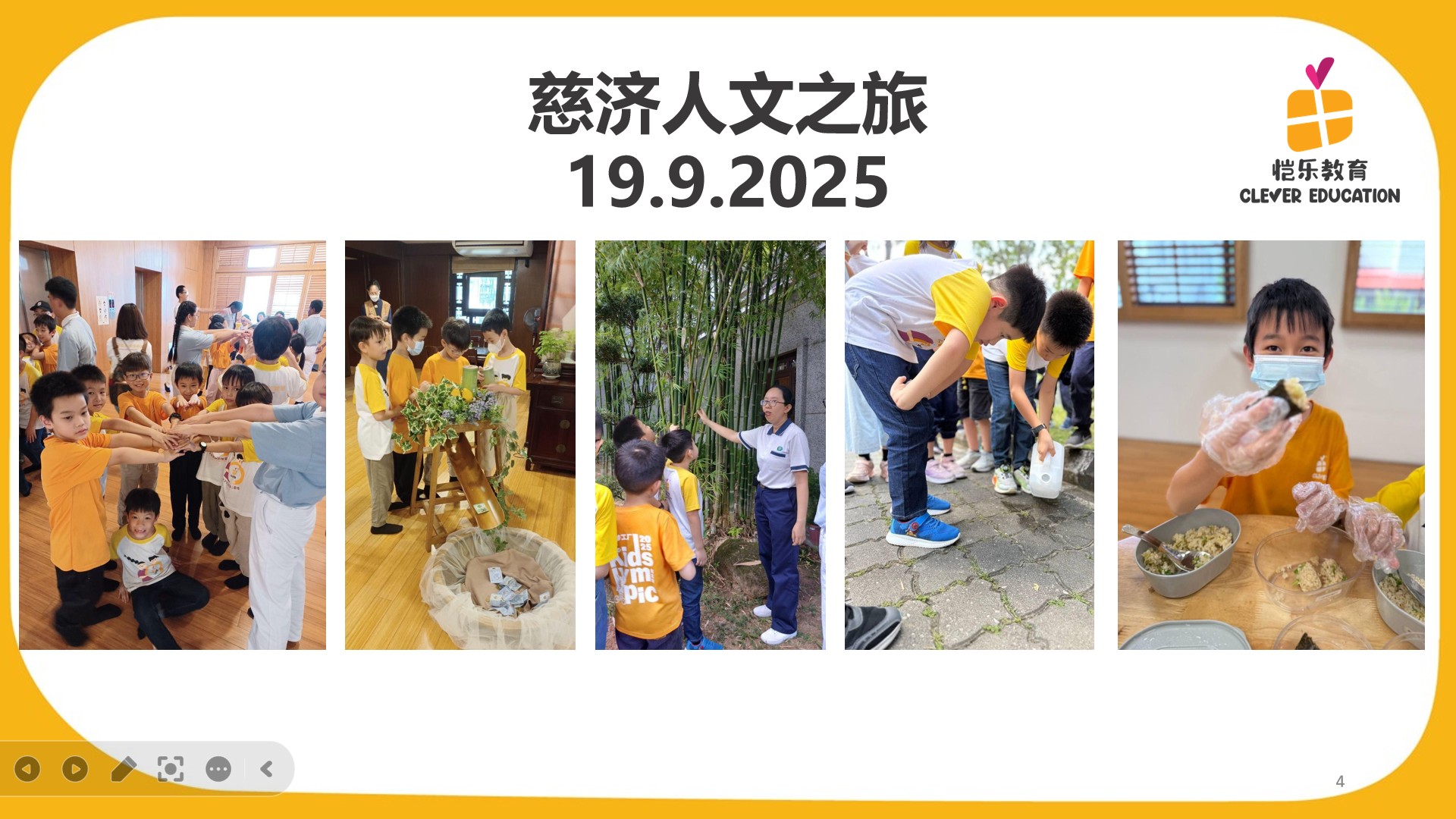 然而,恺乐安亲班的人文课程并未止步于此。今年9月,她们更进一步,带领孩子踏上人文之旅,参访慈济教育中心与静思堂。透过活动与小故事,孩子们学习了感恩与惜福,并领了竹筒回家,开启“竹筒岁月”。10月,蔡园长借台湾花莲的桦加沙风灾事件启发孩子们的悲心与善心,开始在园内让孩子们进行“一人一善”的投竹筒活动。