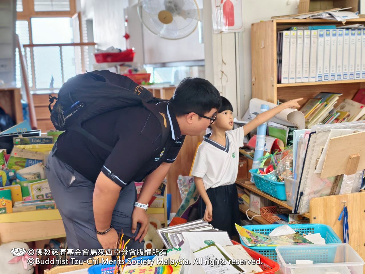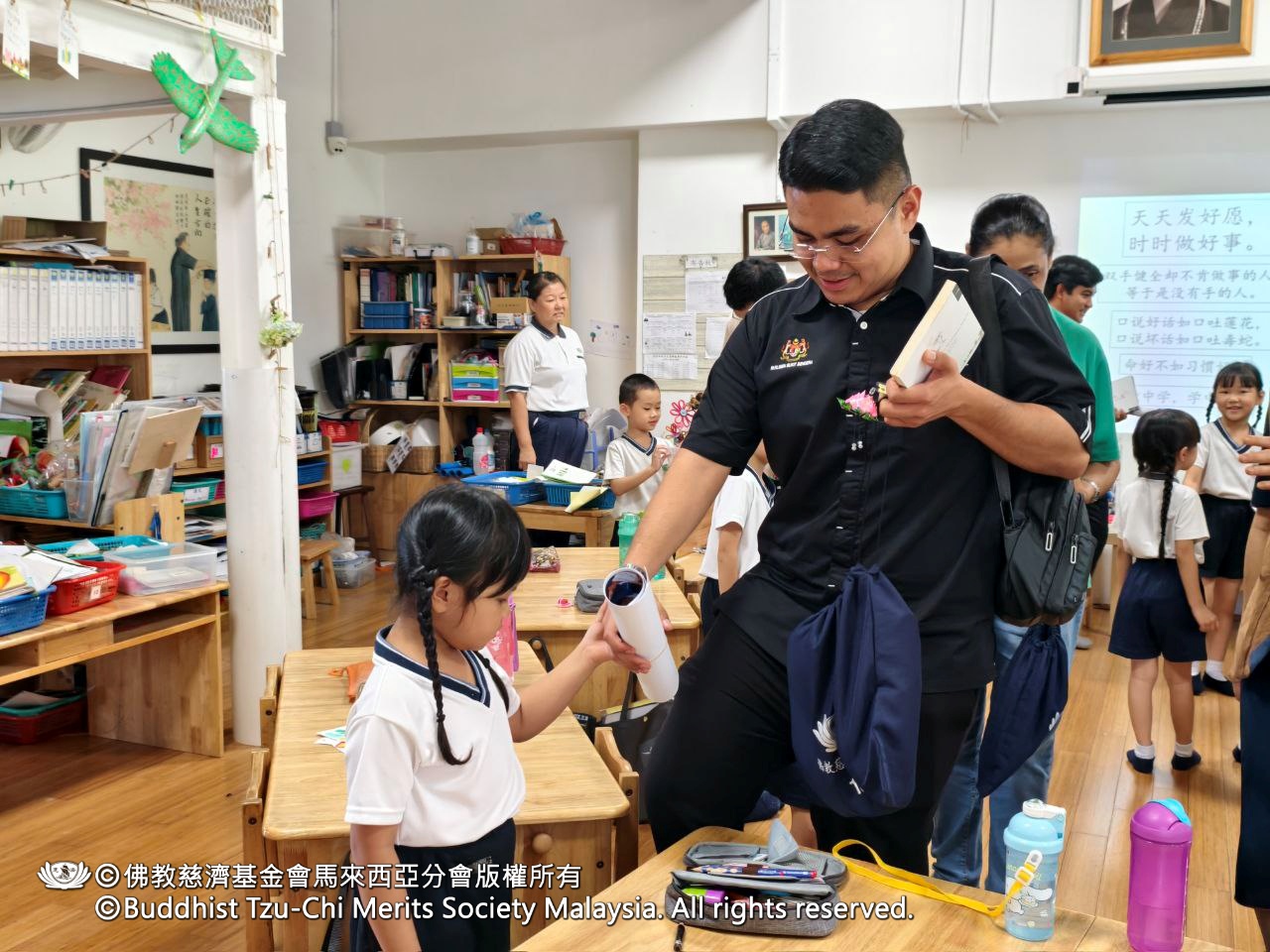 說明會後,與會嘉賓參觀幼兒園,親身感受慈濟教育的溫馨氛圍。五歲毅力班正在人文課室上花道課,六歲勇氣1班則表演手語、贈送靜思語小卡,並為訪客進行「愛的伊比丫丫」捶背服務。在大地之母前合照後,孩子們還為來賓夾上自製的花花夾子,一天的活動在孩子們溫馨的「Selamat tinggal」歌聲中圓滿結束。
