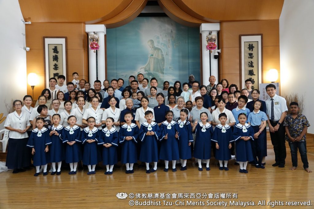 典礼在〈钟鼓勤行颂〉庄严鼓声中拉开序幕,震撼人心。随后,孩子们随着〈无量法门〉音乐合十步入感恩堂,并齐声唱诵〈慈济功德会会歌〉,神情专注稳重,展现三年来人文教育的点滴成果。