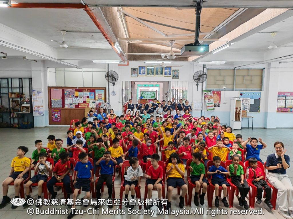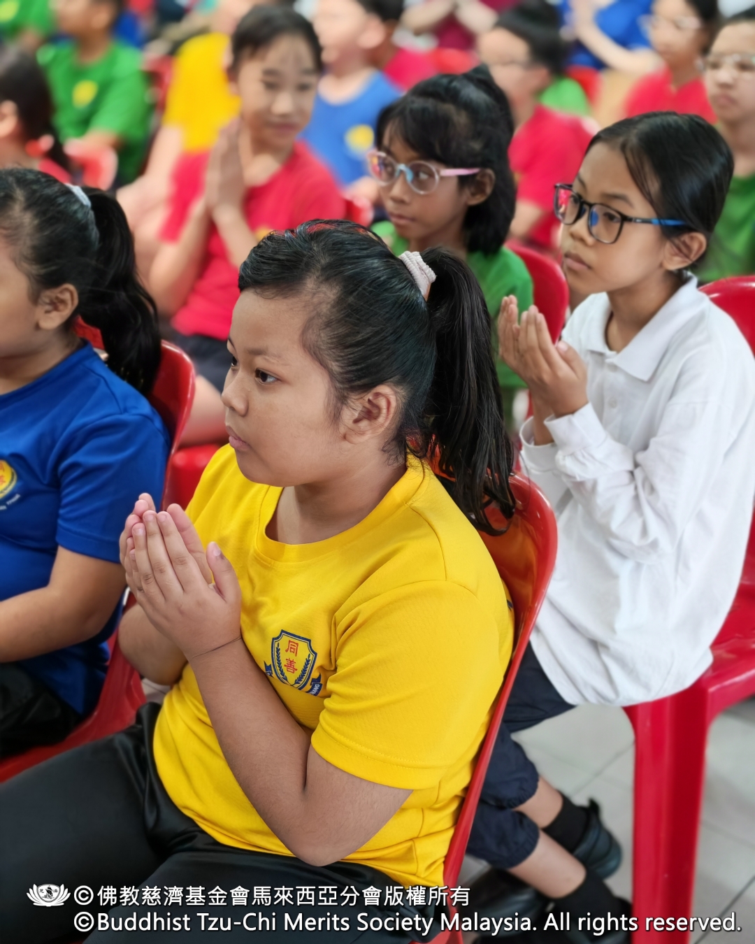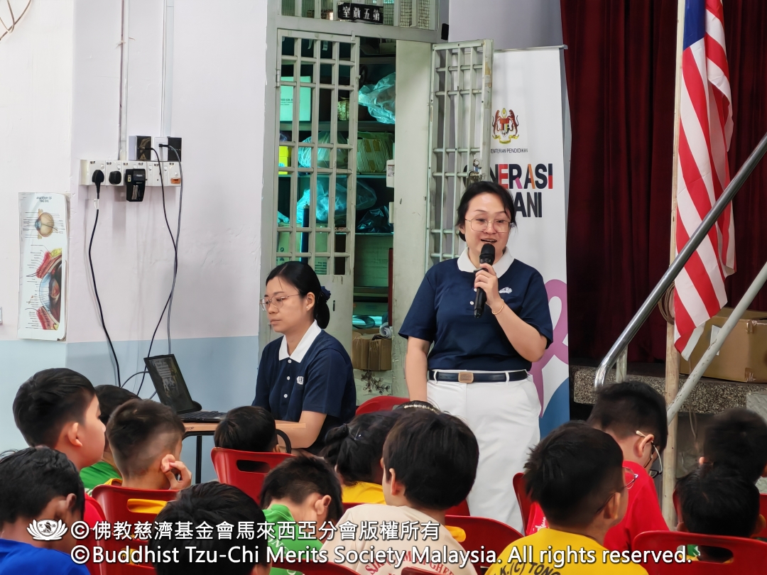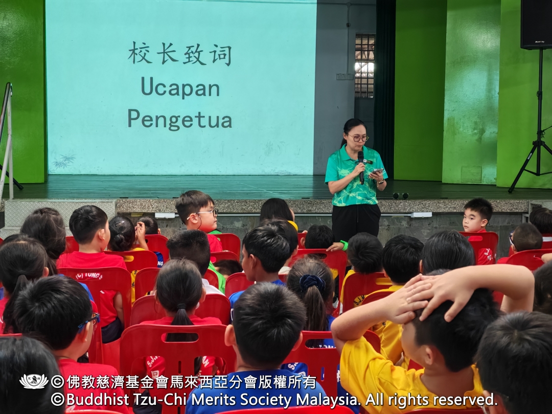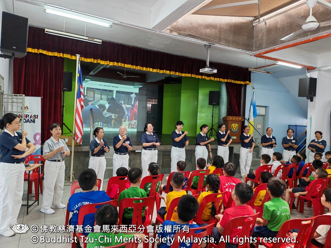 随后,慈济志工以手语演绎双语歌曲《一家人 Kita Satu Keluarga》及《爱与关怀》,将上人的祝福带入校园。在温馨柔和的氛围中,彼此的关怀与善意悄然流动。