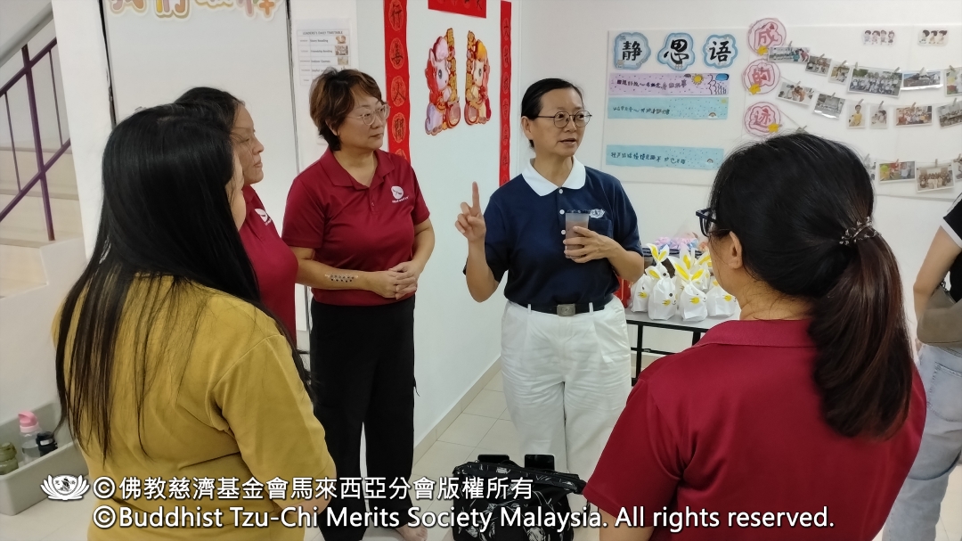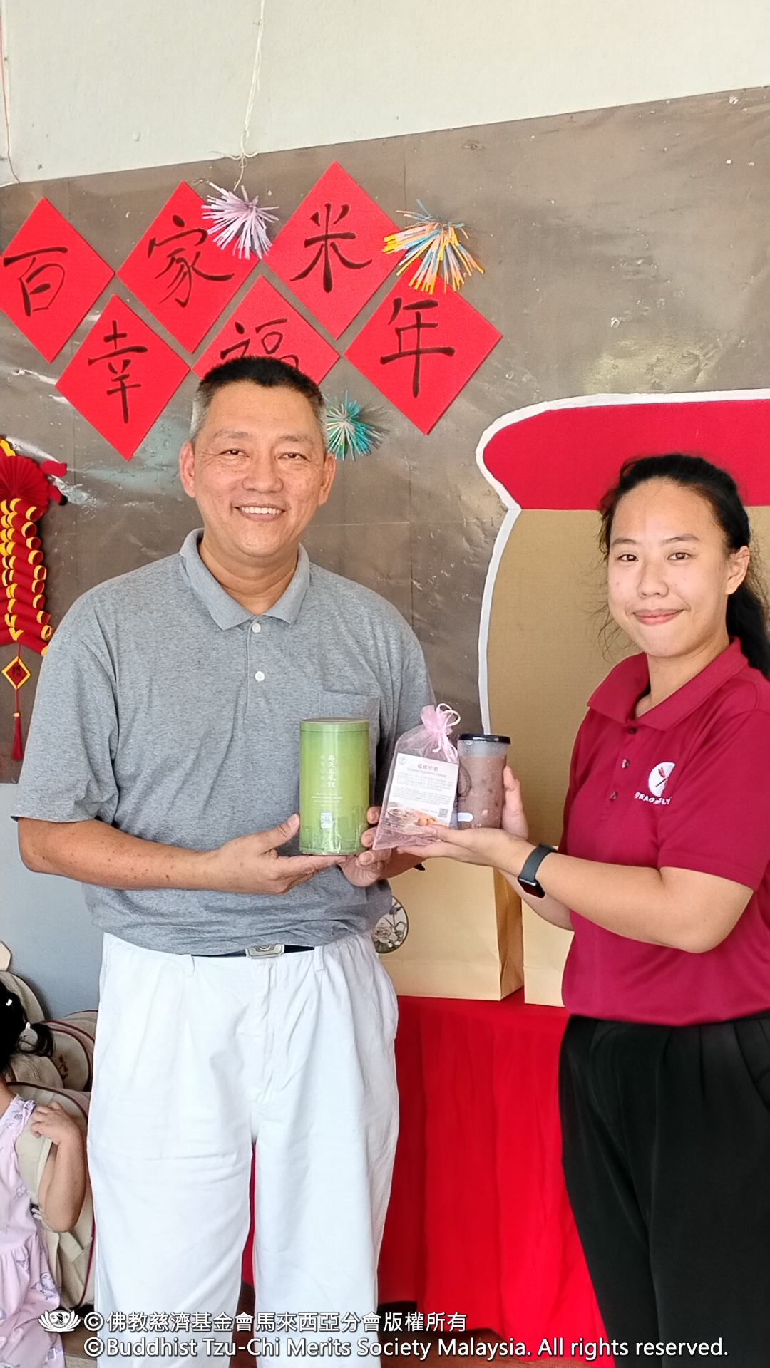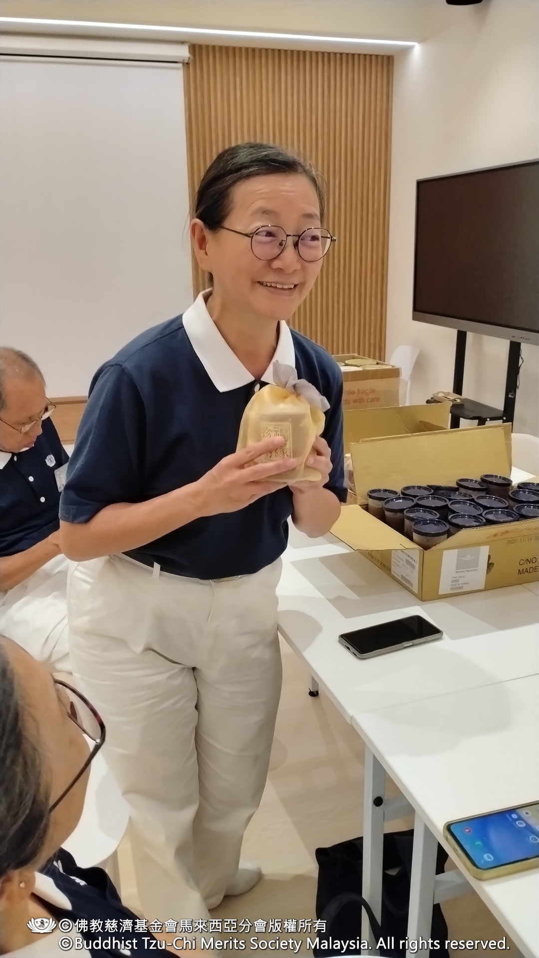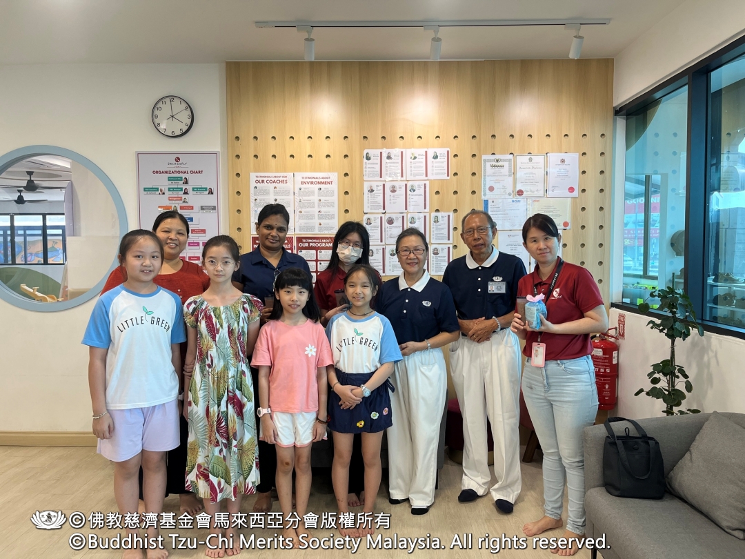 随后,志工与总部职员分组前往旗下九所幼儿园与安亲班继续送爱。在Kota Permai小状元安亲班,学生以百家米煮成的腊八粥及亲手制作的点心与志工结缘;Bukit Minyak红蜻蜓幼儿园也将师生平日投入的竹筒善款交予志工,把点滴爱心传递出去。