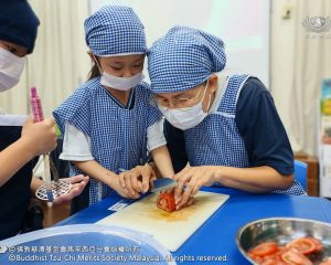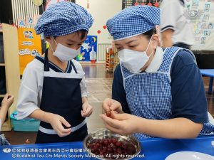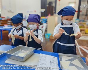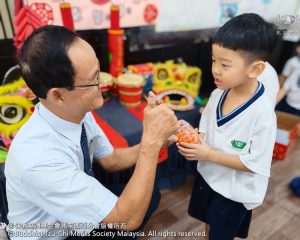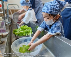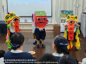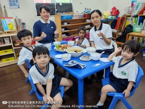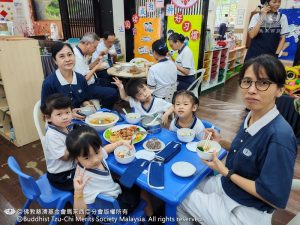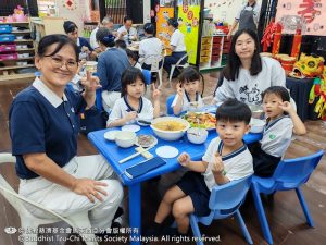 曾慈规主任引导孩子们,要怀着感恩的心享用的团圆饭,并用虔诚的心祝福天下每一个人都能温饱、平安健康。并以师太上人教诲, 【莫忘竹筒岁月初心】,鼓励孩子将一小部分的红包投入竹筒,帮助苦难的人。