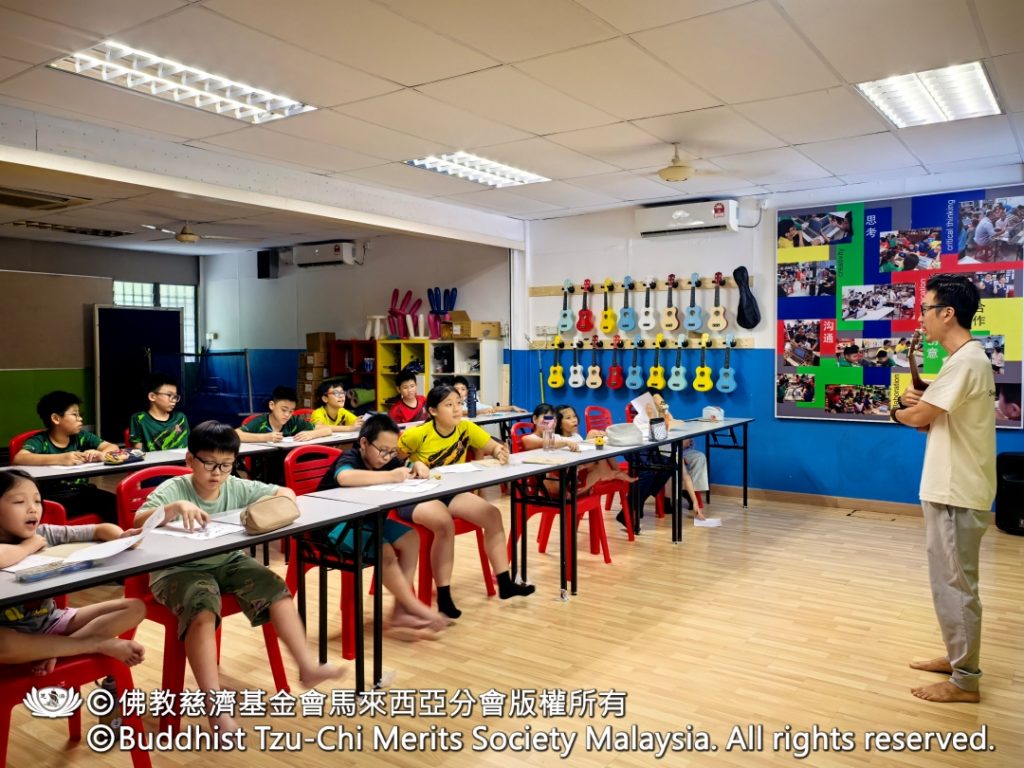 由于接下来的两个星期五恰逢开斋节学校假期,孩子们无法照常上课。志工与 Sean 老师商量后,决定让孩子们把乐器带回家练习,希望他们能善用假期勤加练习,把课堂上学到的六个和弦熟练掌握,也让整体学习进度更快。