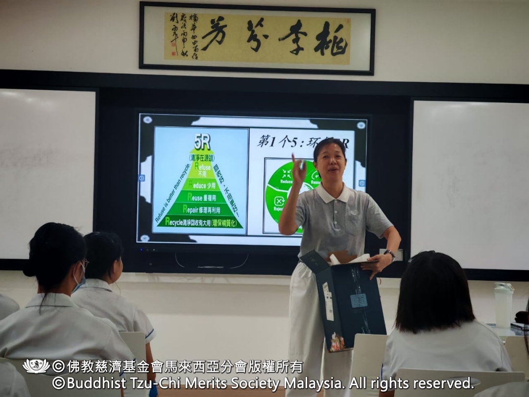 活动中,符绩文师兄带动“环保十指口诀”与环保5R口诀,老师与学生一同比手语、念口诀,现场气氛活跃。志工进一步鼓励学生实践“五零生活”,并随身携带环保五宝——杯、碗、筷、手帕与购物袋,从日常小事做起,累积改变的力量。