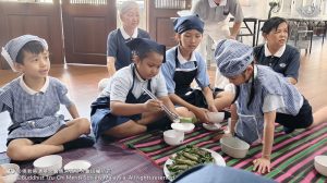 李承羽及张志仁都不约而同的认为,原来他们所熟悉的素香松拿来炒,会是那么好吃。原来香积饭除了是米饭,还可以做成糕点。帮忙准备香蕉叶的尤柔渝和郑博轩分享,看起来很普通的香蕉叶,处理起来一点都不简单。最后煎烤糕点时,戴璟喆因为不小心碰到热锅的边缘而烫伤。这令他想起爸爸、妈妈和奶奶每天不厌其烦的为家人煮饭,原来是很辛苦。看到人文团队的师姑们,用自己的休息时间来陪伴他们、教导他们,孩子们都心存感恩心。