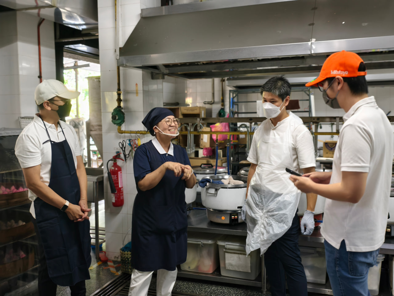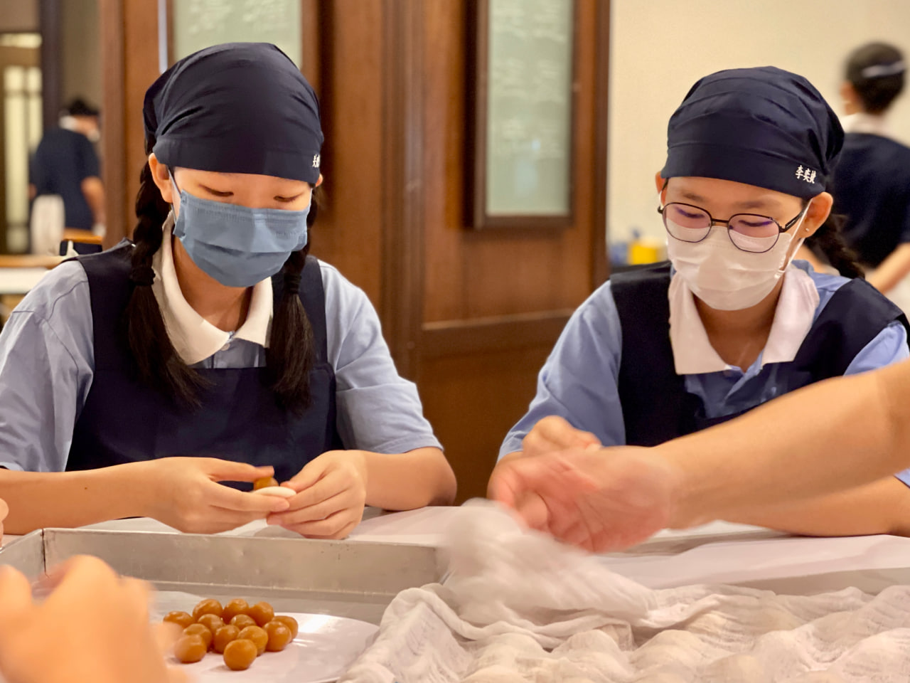 理念傳達結束後,親子們紛紛換上圍裙,前往齋堂。大家按照現場指示與功能分配,有序投入到“壽桃生產線”中,分工協作、默契配合。製作壽桃的過程,不僅是一項手工體驗,更是一次內心的修行—透過揉麵團、捏造型的每一個細節,學習沉下心來關照內心,同時在與他人的协作中,結下善緣。